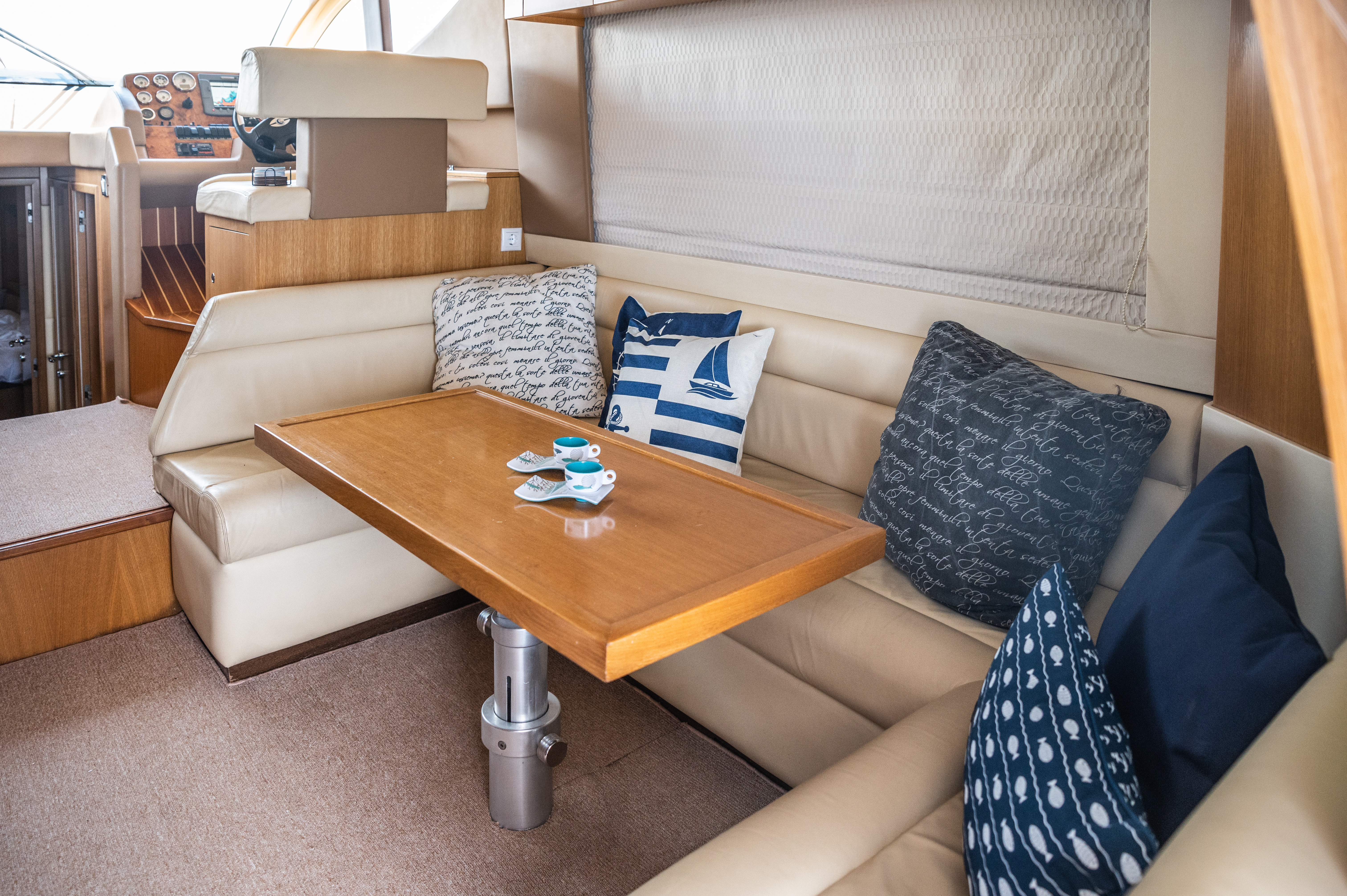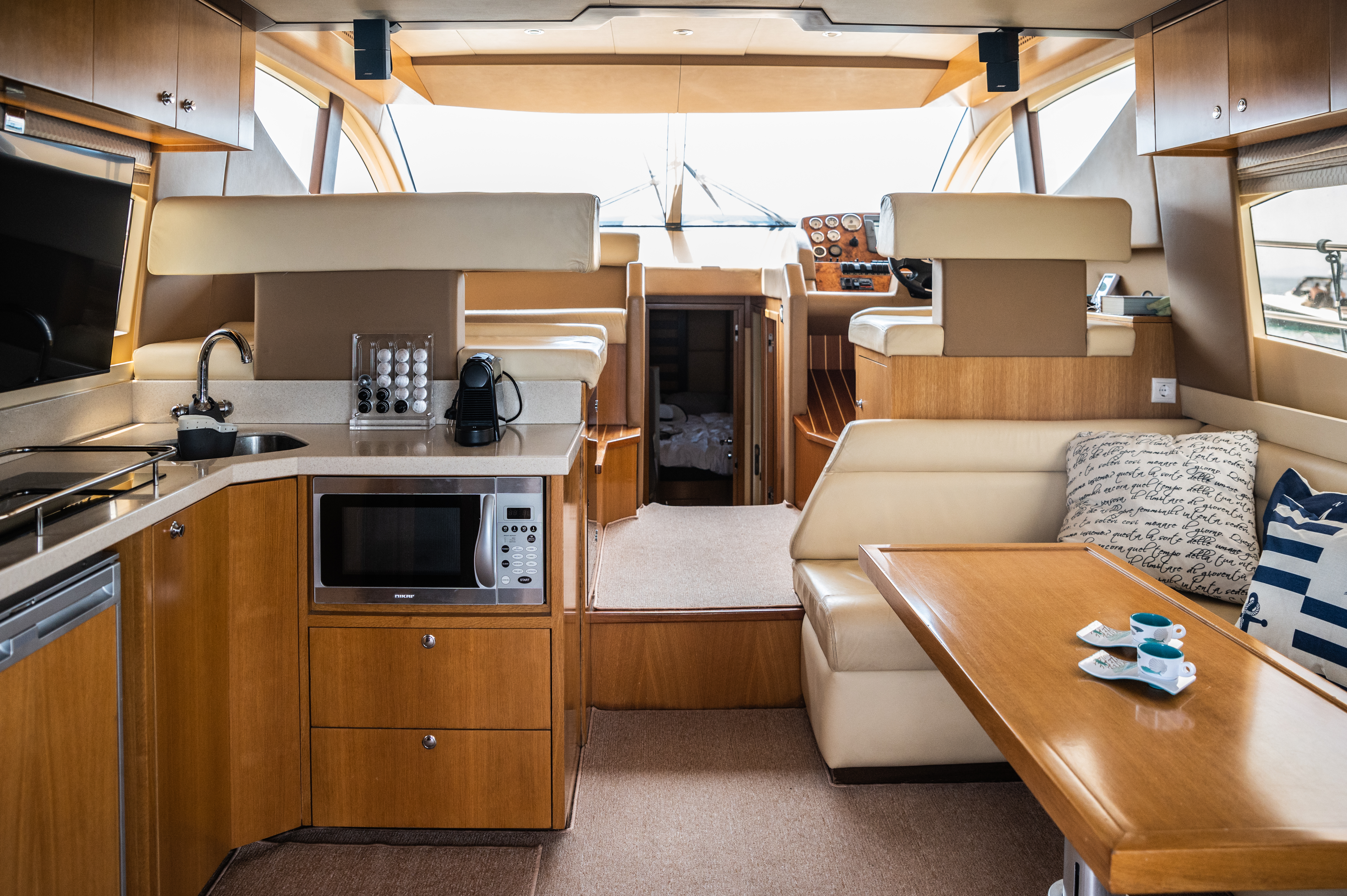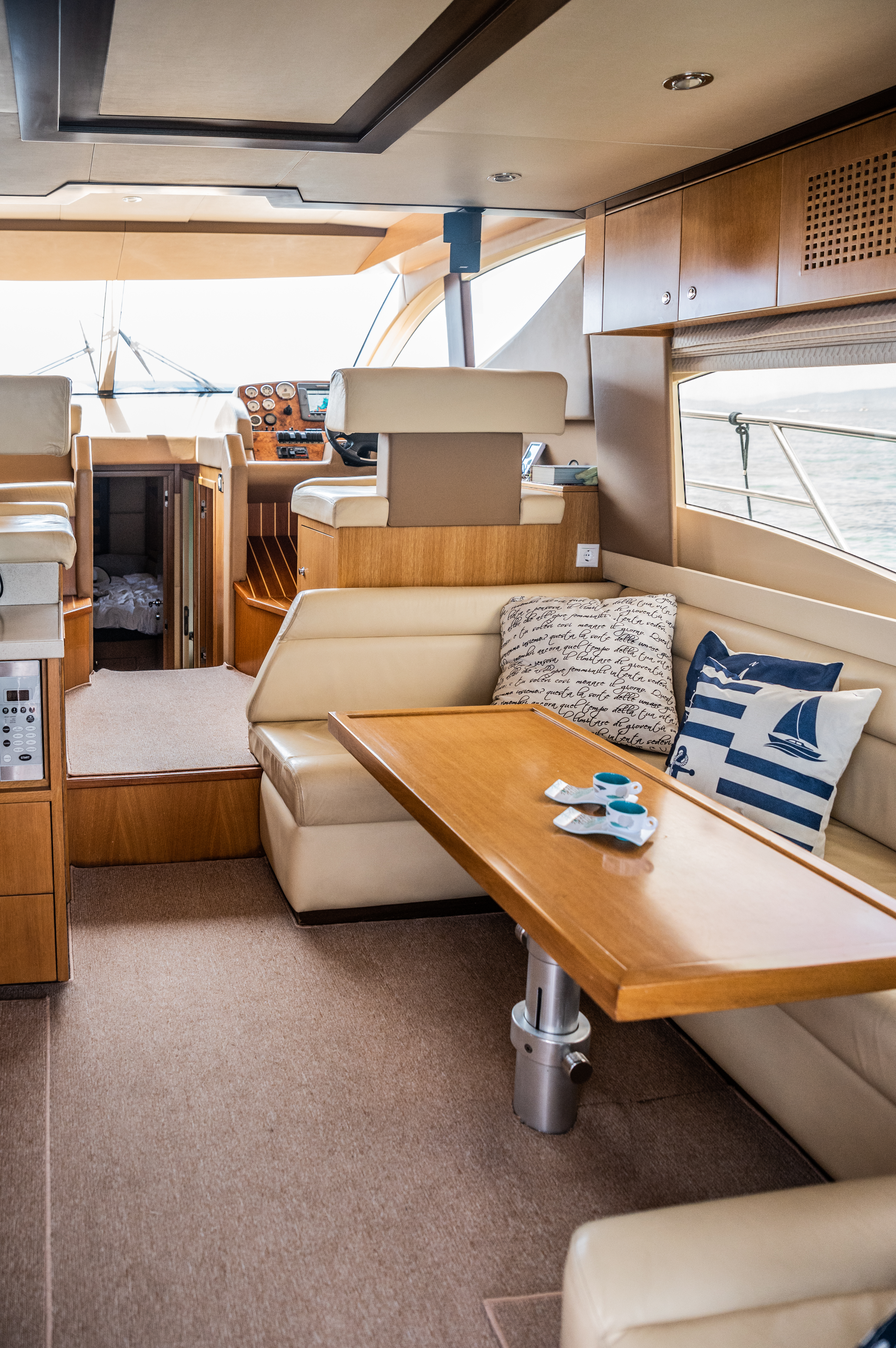 Designed for elegance and functionality, the interior of our Majesty 44’ offers a warm, inviting space where comfort meets refined style. Whether you’re enjoying a short cruise or a full-week charter, the yacht’s layout is thoughtfully organized to ensure privacy, convenience, and relaxation for all guests.