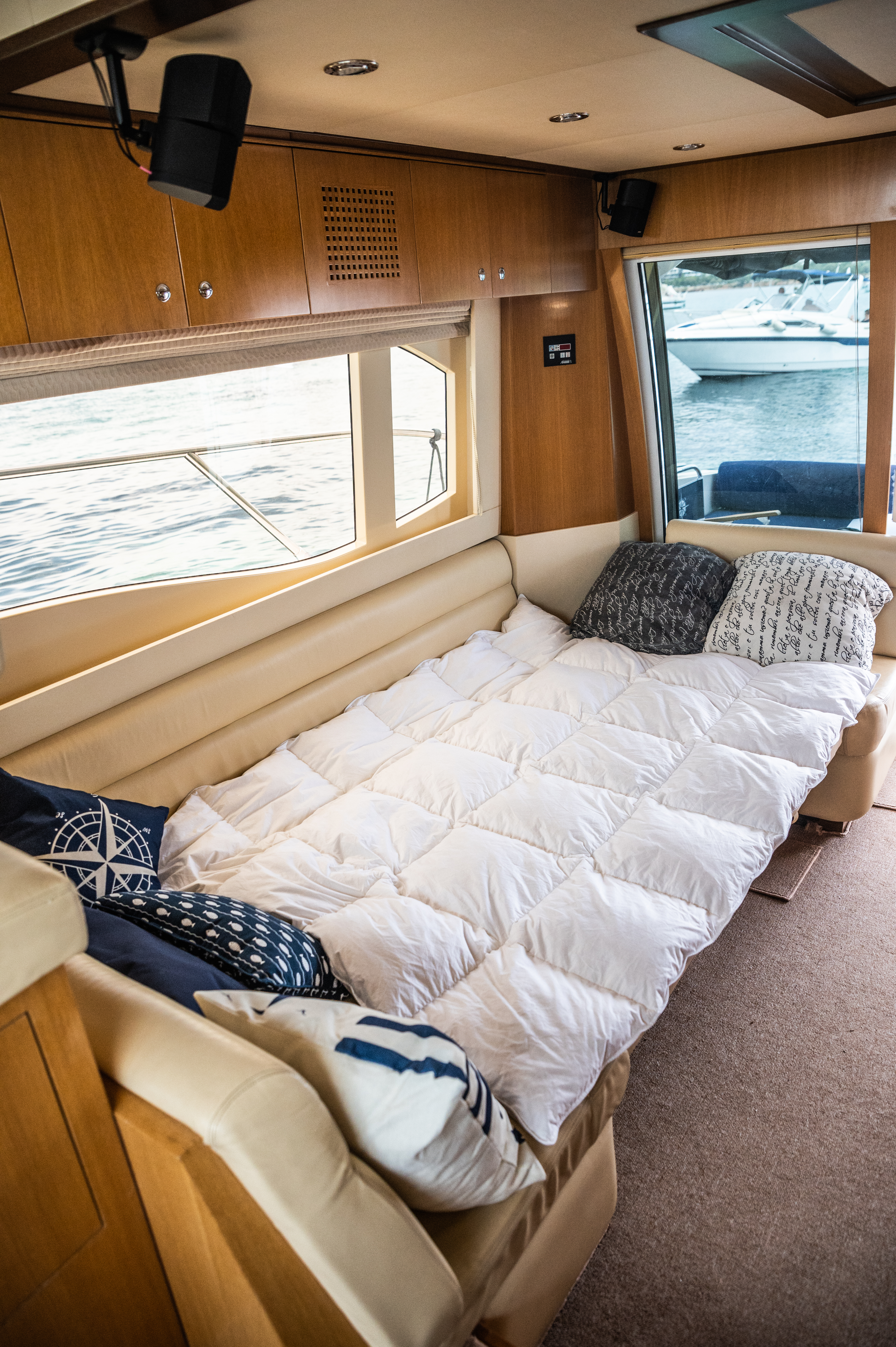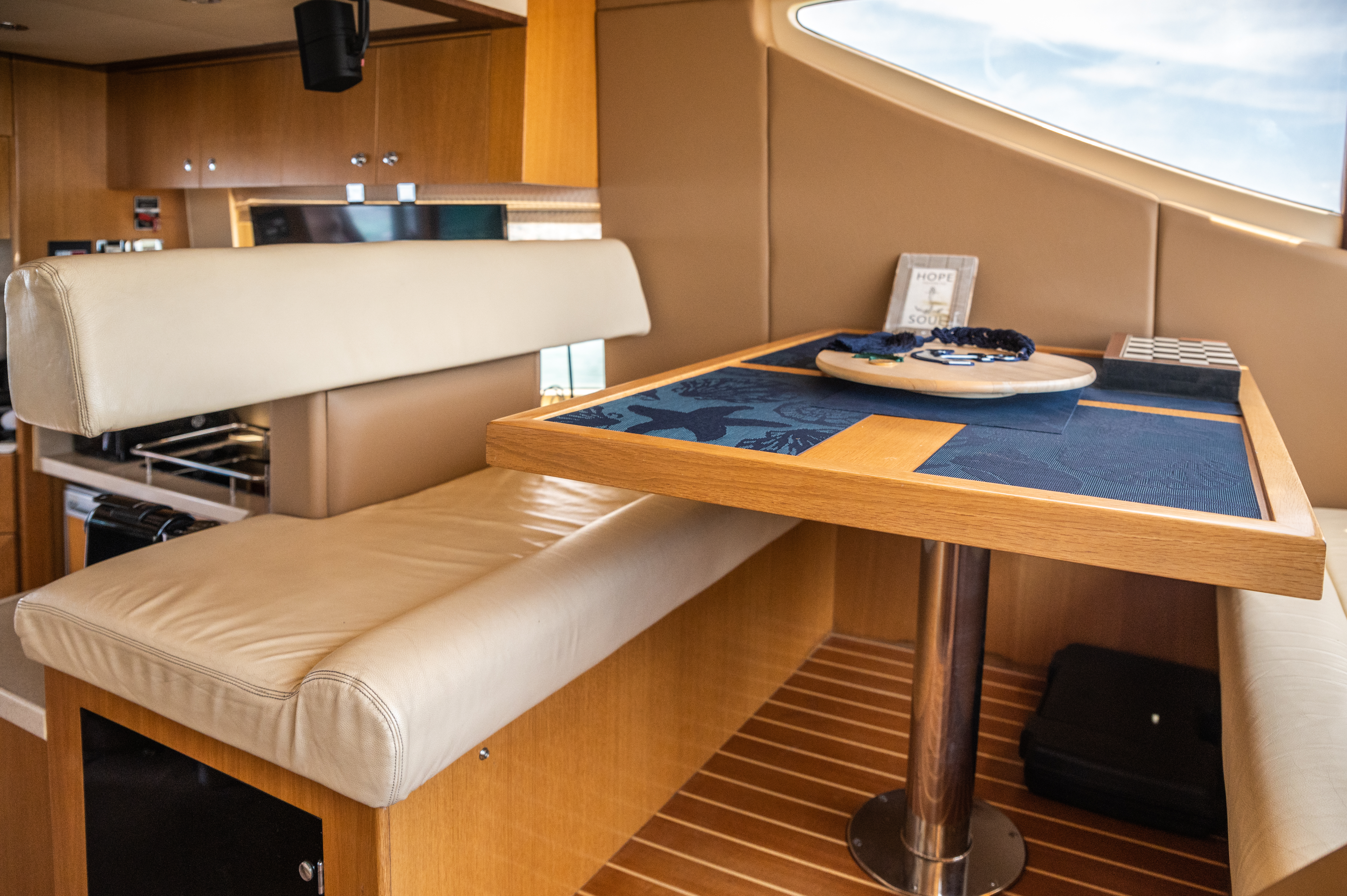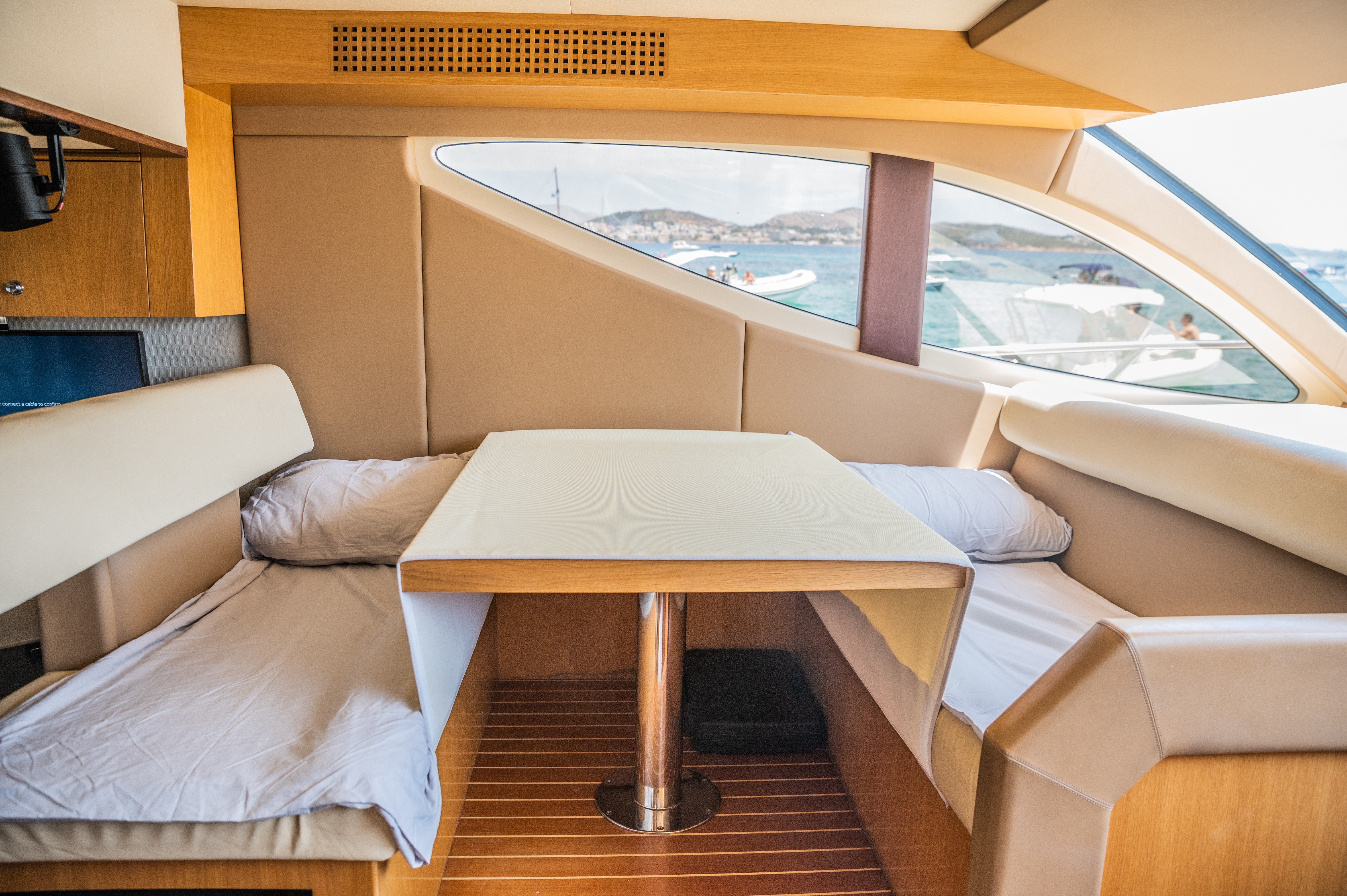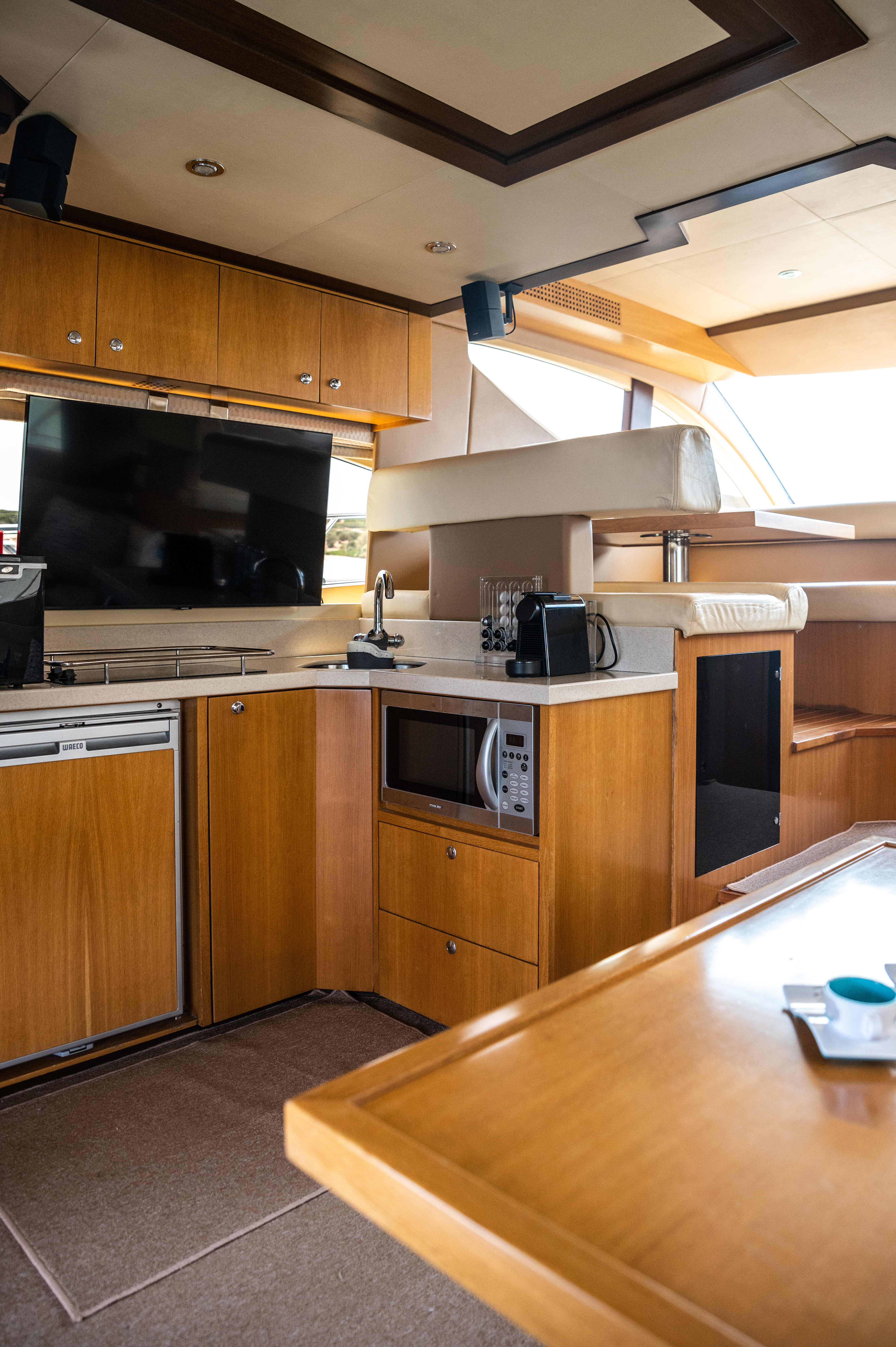 Designed for elegance and functionality, the interior of our Majesty 44’ offers a warm, inviting space where comfort meets refined style. Whether you’re enjoying a short cruise or a full-week charter, the yacht’s layout is thoughtfully organized to ensure privacy, convenience, and relaxation for all guests.